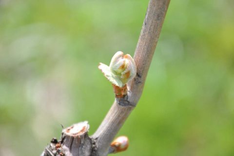 4月後半から剪定した少し下の部分から新しい芽がでてきます。一見枯れ果てたぶどうの枝から青々した新芽が伸びてくると生命の息吹を感じずに入られません。この時期一番気をつけないといけないことは霜害。三寒四温で暖かくなる季節ですが、夜間はぐっと冷え込み、ときに新芽が枯れてしまうほどの低温になります。